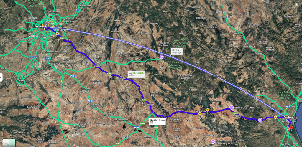 Si venís desde la capital, Madrid, la opción más cómoda y rápida es tomar el AVE (alta velocidad). El AVE conecta Madrid con Valencia en apenas 1 hora y 40 minutos. Es una forma rápida y eficiente de viajar, y además disfrutaréis de un cómodo trayecto mientras os acercáis a la costa mediterránea.